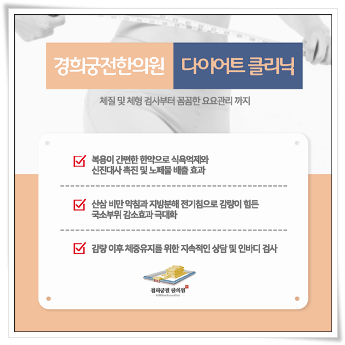 다이어트로 살 빼기 힘드시다면 02-522-2066 혹은 카카오톡 플러스 친구 @경희궁전한의원 @경희궁전다이어트 를 통해 한방치료, 한방 다이어트에 대해 문의해 주시길 바랍니다.