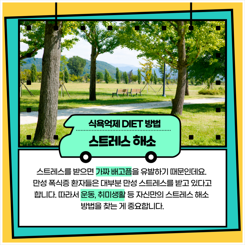 만성 폭식증 환자들은 대부분 만성 스트레스를 받고 있다고 합니다. 운동, 취미생활 등 자신만의 스트레스 해소 방법을